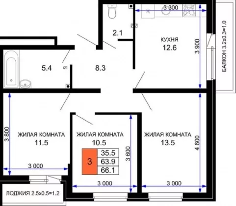 Продается 3-х комн. новостройка, 66.1 кв.м., 2/16 эт