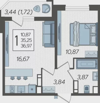Продается однокомнатная новостройка, 36.97 кв.м., 16/21 эт
