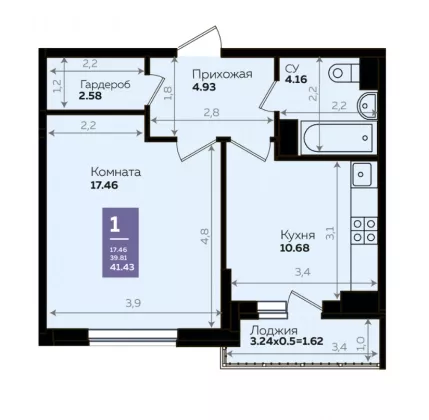 Продается однокомнатная новостройка, 41.43 кв.м., 12/24 эт