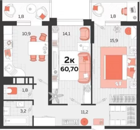 Продается 2-х комн. новостройка, 60.7 кв.м., 21/24 эт